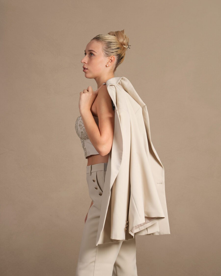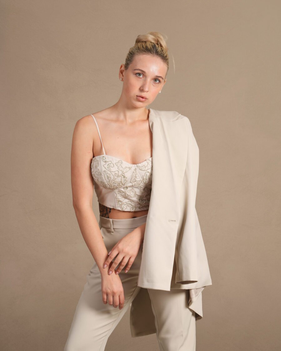 The top is a cropped bustier-style top in a light beige color. It features delicate spaghetti straps and a sweetheart neckline, which adds a feminine and elegant touch to the design. The fabric of the top is adorned with an intricate lace pattern, adding texture and visual interest.