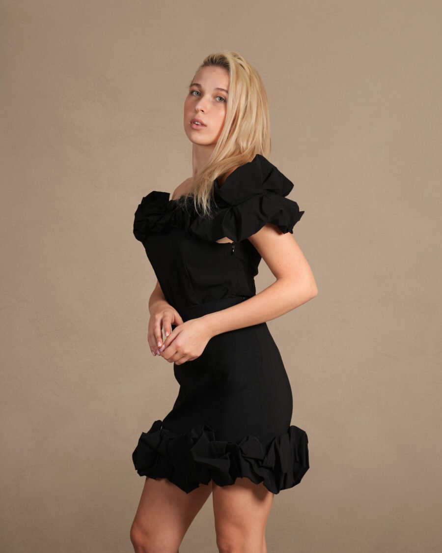 The outfit is a chic black dress featuring dramatic ruffle details. The dress is off-the-shoulder, with large ruffles adorning the neckline, creating a bold and stylish look. The fitted silhouette accentuates the waist and hips, while the hemline also features ruffle detailing, adding a playful and elegant touch. The dress ends above the knee, making it perfect for cocktail parties or formal events.