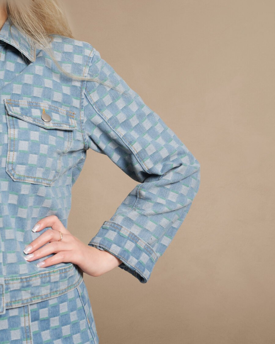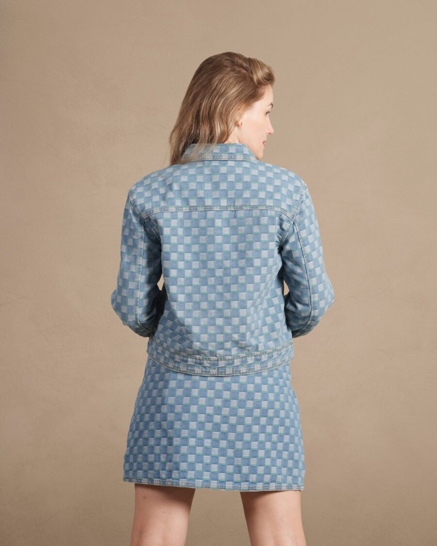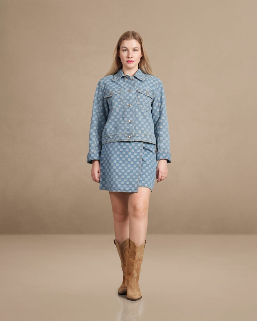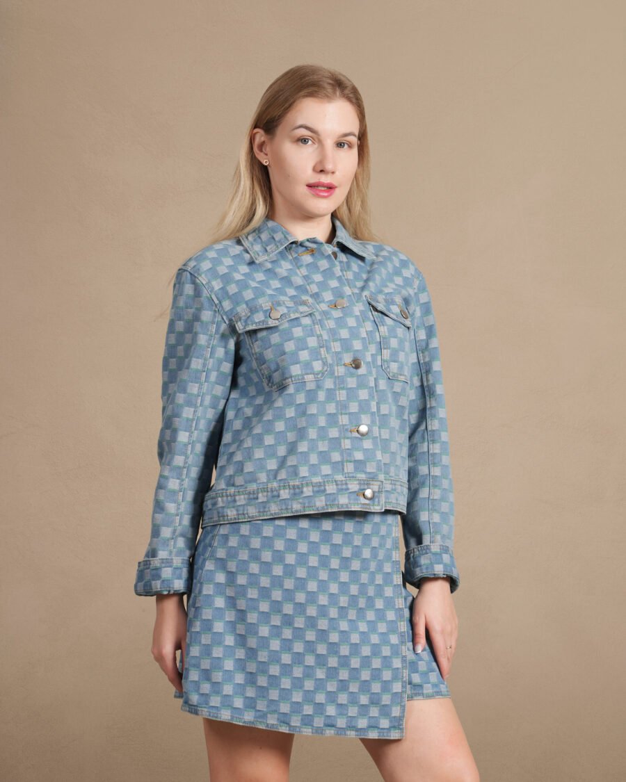 A classic and versatile set featuring a stylish denim skirt and jacket. The mini skirt is adorned with a chic flap detail, adding a touch of sophistication to its timeless design. Paired with a regular fit jacket, this ensemble exudes effortless charm and casual elegance.