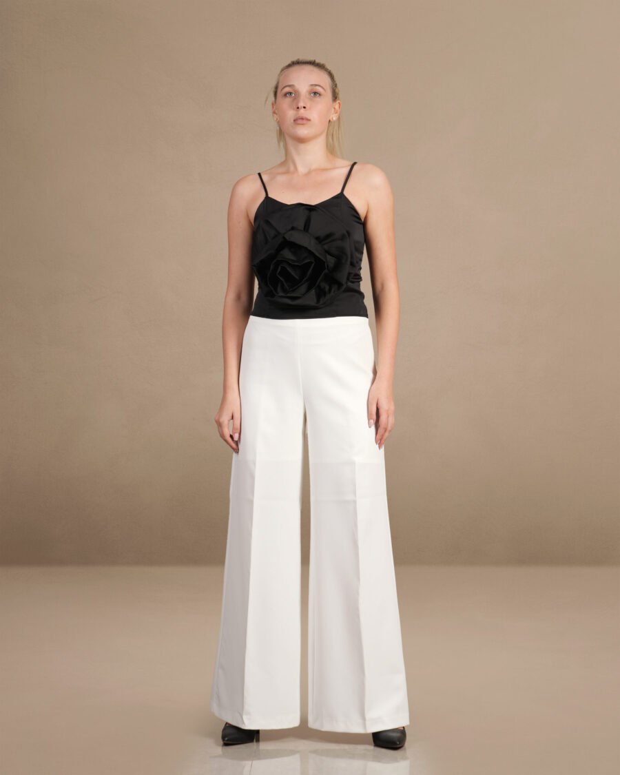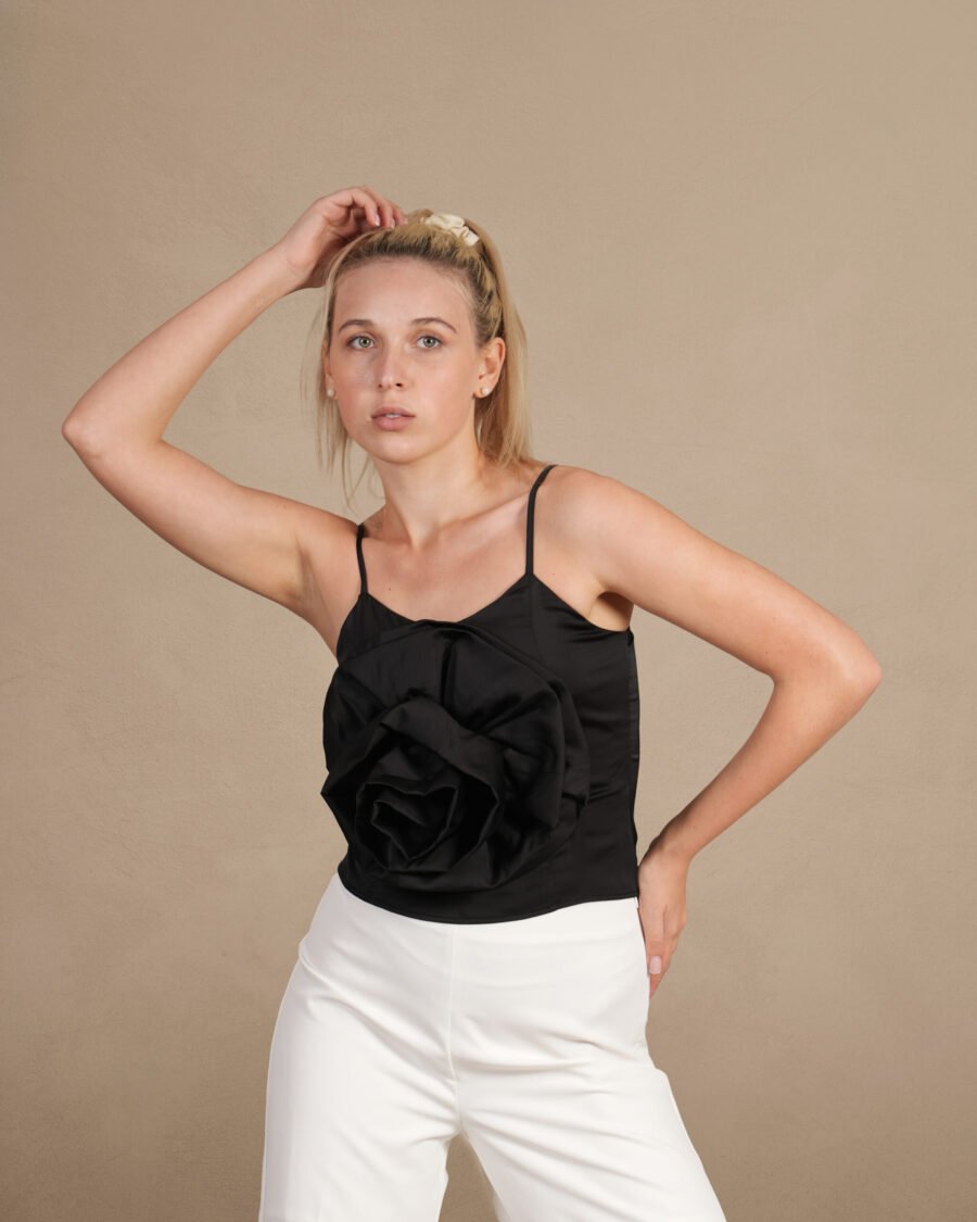 A black halter neck top with a striking big flower design adds flair to any outfit.