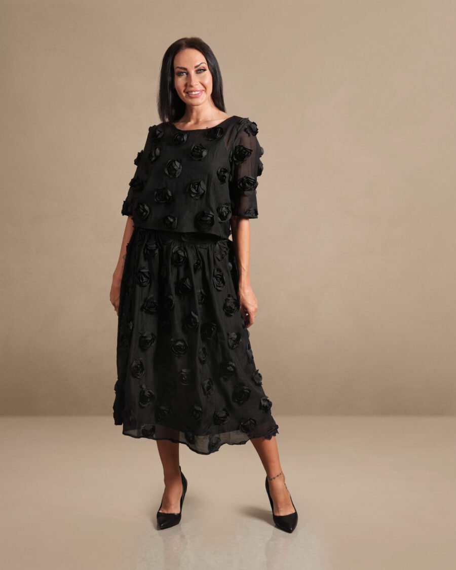 A captivating two-piece set that exudes sophistication and grace. Crafted from delicate organza material in classic black, both the short-sleeved blouse and A-line maxi skirt are adorned with intricate floral embellishments, adding a touch of whimsy and romance to the ensemble. The wide skirt drapes elegantly, creating a flattering silhouette with its A-line cut. Perfect for evening events or special occasions.