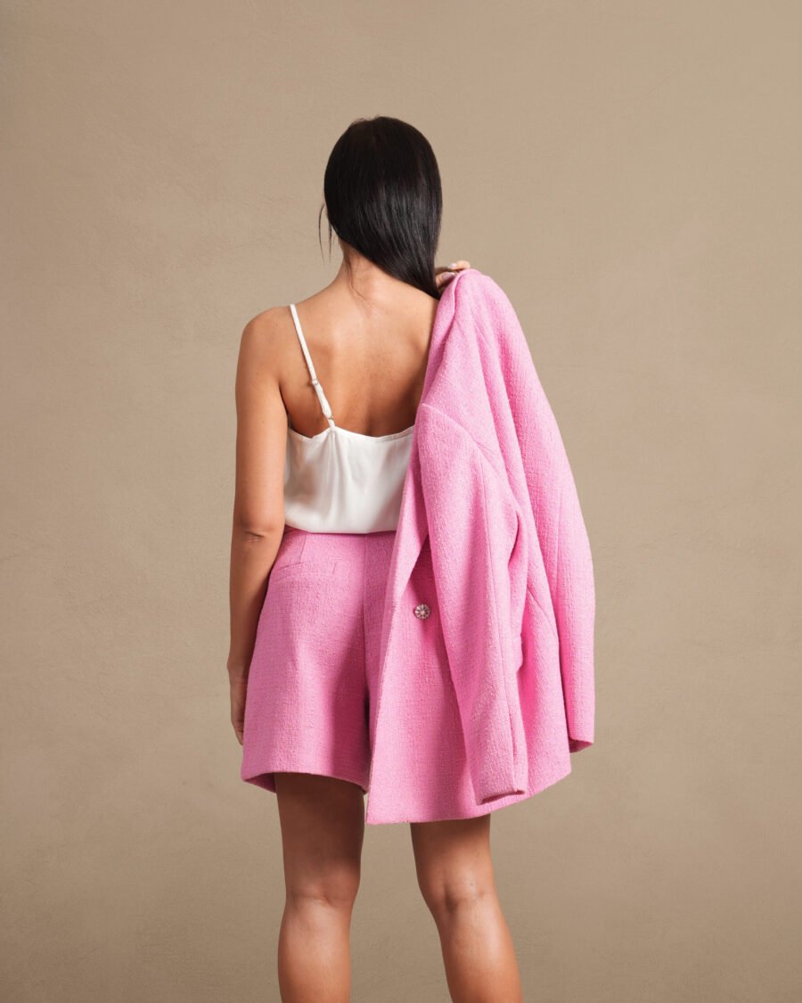 The top is a white, sleeveless blouse with a relaxed fit. It features delicate spaghetti straps and a subtle lace detail along the neckline, adding a touch of elegance and femininity to the design. The fabric appears to be lightweight and flowy, providing a comfortable and airy feel.