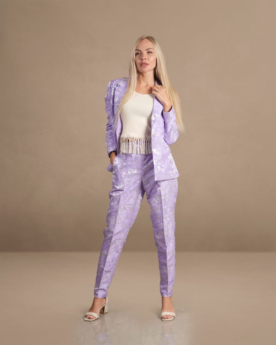 The suit is a stylish and elegant two-piece set in a soft lavender color with a subtle floral pattern. The blazer is designed with a tailored fit, long sleeves, and a classic lapel collar. It has a slightly structured silhouette, giving it a polished and sophisticated look. The matching pants are high-waisted with a slim, tapered fit, featuring the same delicate floral pattern as the blazer. They have a relaxed yet tailored style, providing both comfort and a refined appearance.